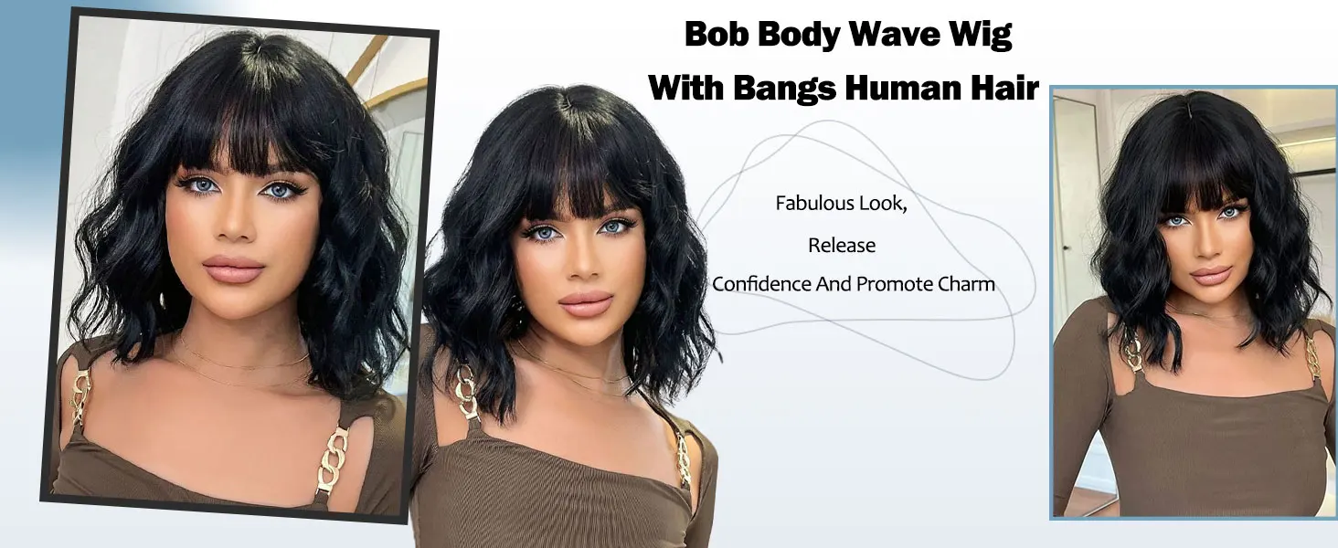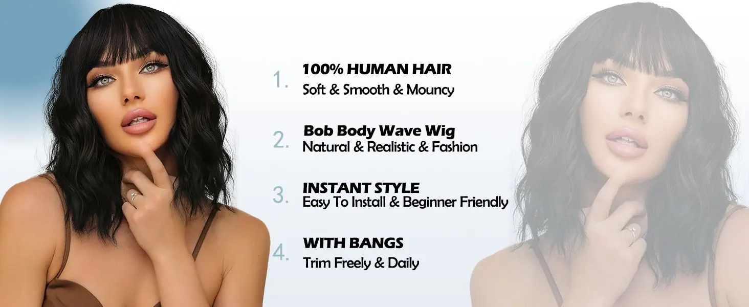 【Short Bob Wig Human Hair with Bangs】Human hair wig with bangs salon pro cut, the bangs are full, shiny, and natural, the bangs can be trimmed or permed according to your face shape and can be center part bangs and side part bangs based on your preference. More importantly, Every time the bangs change, you will get a new hairstyle that showcases a different charm.
