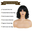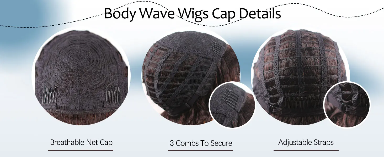 【None Lace Human Hair Wig Cap Details】 Human curly hair wig with bangs cap comes with two adjustable straps and three combs inside to help secure it on your head. The open cap design provides superior ventilation, offering maximum scalp cooling and more comfortable wear without feeling stuffy.