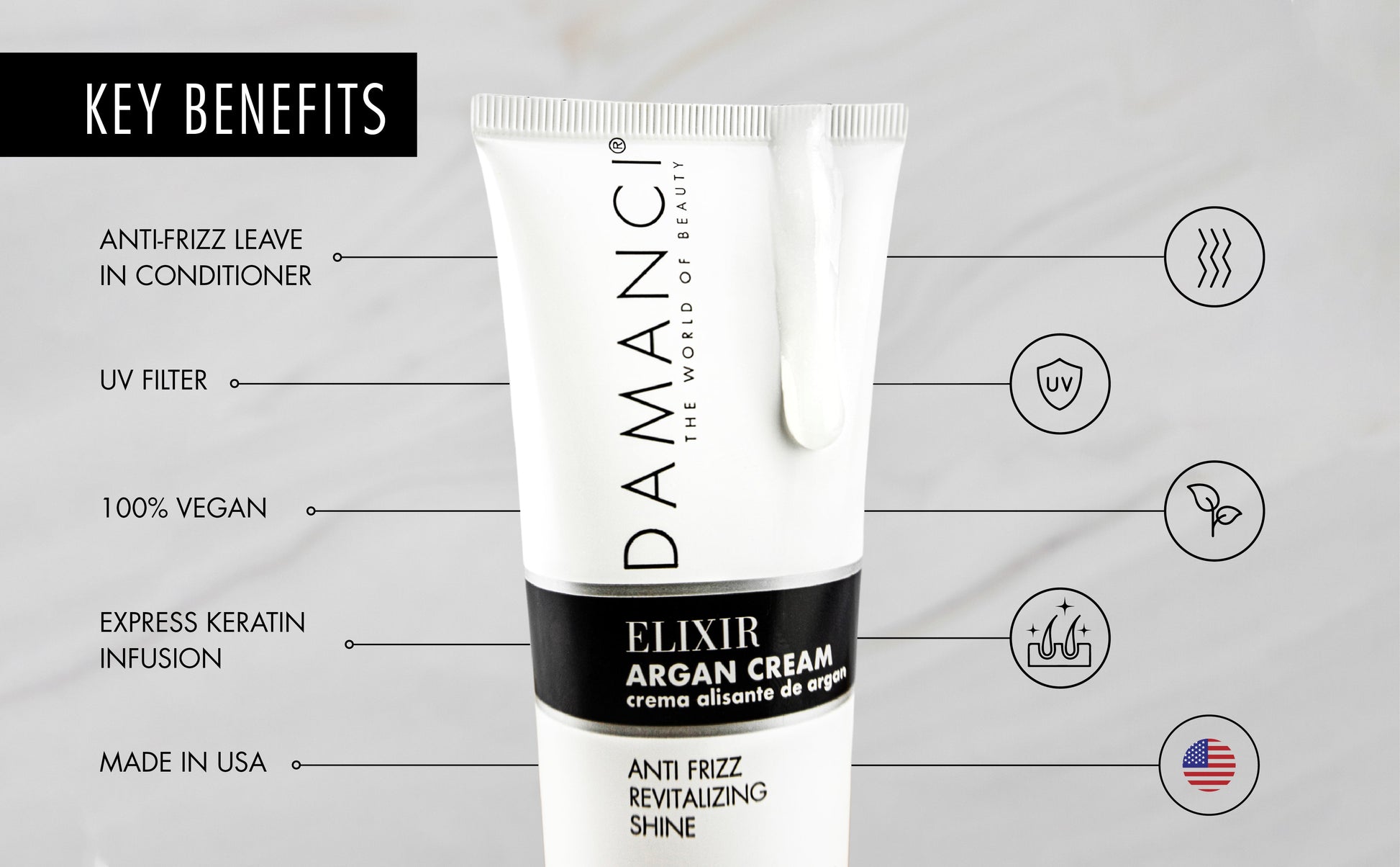 Our luxurious Elixir Argan Cream is designed to be quickly absorbed into the hair shaft, allowing its minerals, antioxidants and vitamin E to fortify, hydrate, soften and protect strands at the deepest levels. It also provides a revitalized, intense and lasting shine.