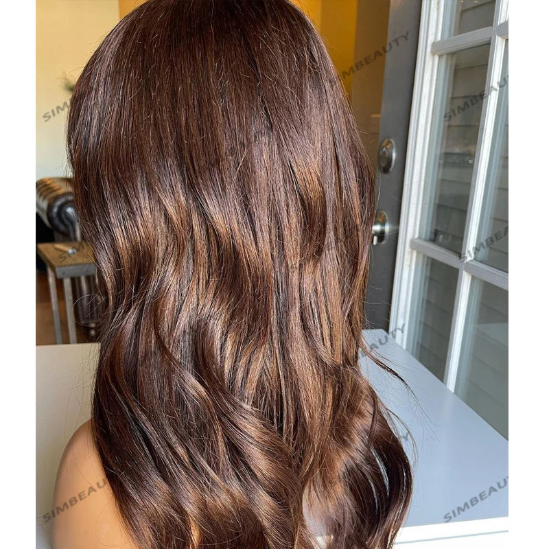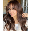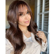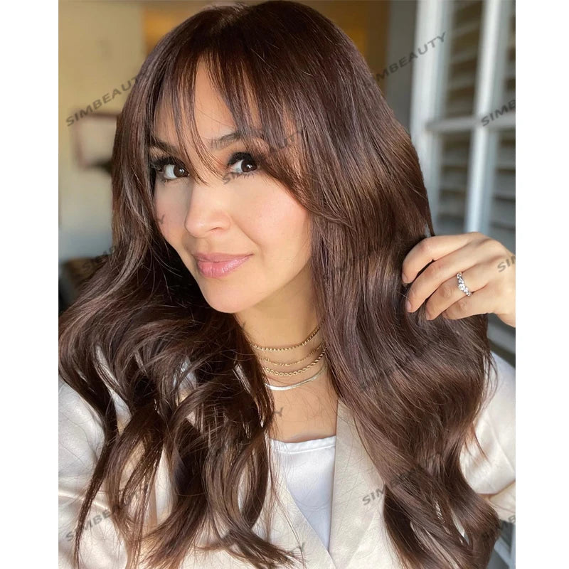 Natural 100% Remy Human Hair Women Wigs with Curtain Bangs 200Density Fringe Reddish Brown Wavy 5x5 Lace Closure Wigs for Women